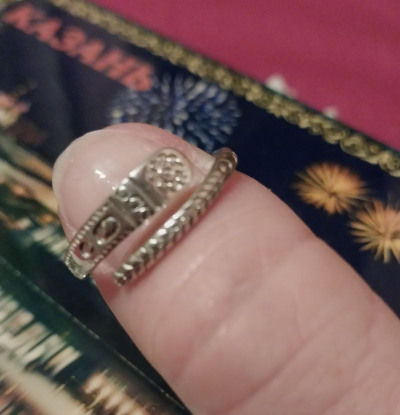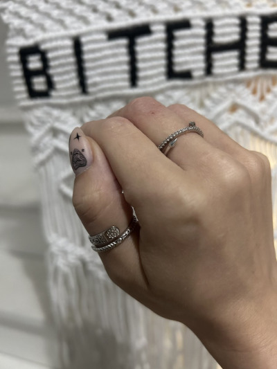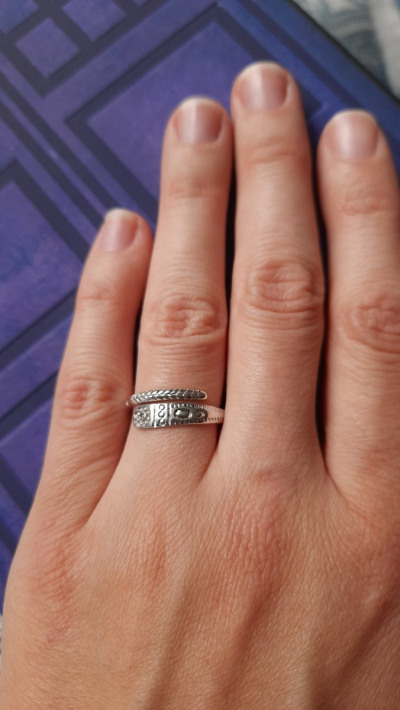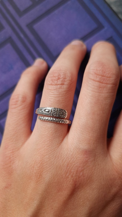 Серебряное кольцо необычной формы и рисунка на нем. Показала внучке и она попросила купить ей его на День Рождения. Сейчас уже полтора года носит его не снимая. прекрасное кольцо.