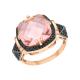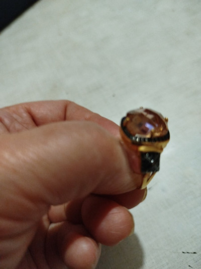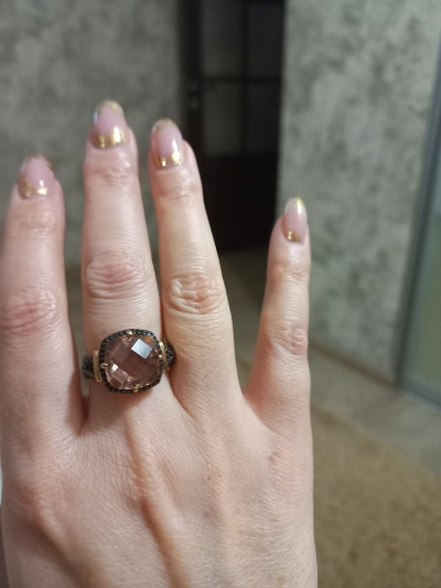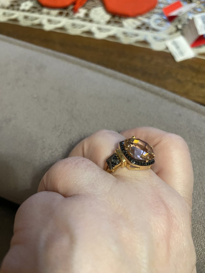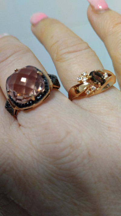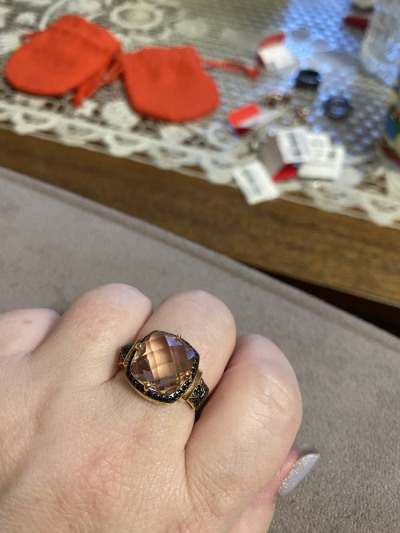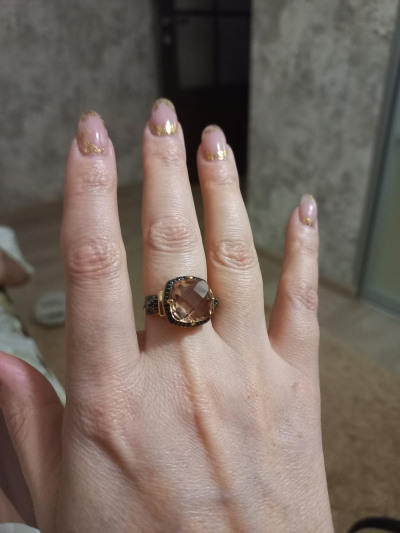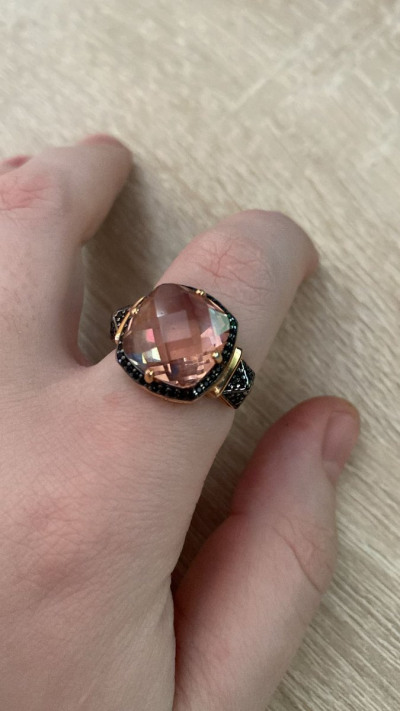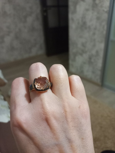 Шикарное кольцо, обращает на себя внимание крупный камень, отделанный чёрными фианитами. Смотрится как золотое с морганитом и чёрными бриллиантами. Жаль что был только один размер, чуть великовато, но все равно купила 2 штуки, одно кольцо подарила подруге.. Она в восторге!.
