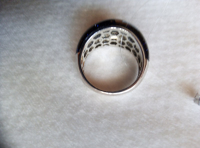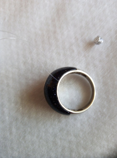 Яркий, контрастный, искрящийся авантюрин, его ширина 3-7 мм, высота 4 мм. Вклеен аккуратно, зазоров нет. Кольцо родировано внутри и снаружи, снимать легко. В прохладе размер 1в1.