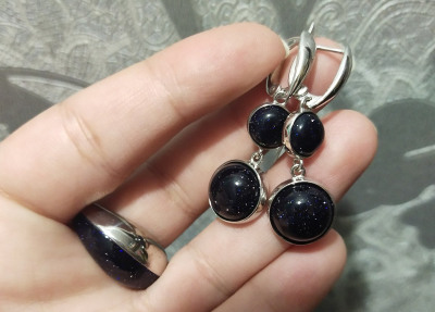Украшение в стиле хай-тек. Камень искусственный, но выглядит космически. Глубокий синий цвет с внутренними искрами особенно заметными при искусственном освещении.