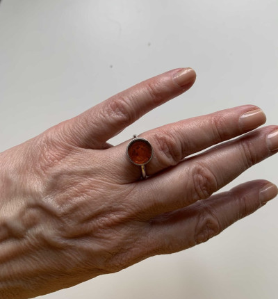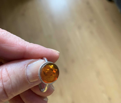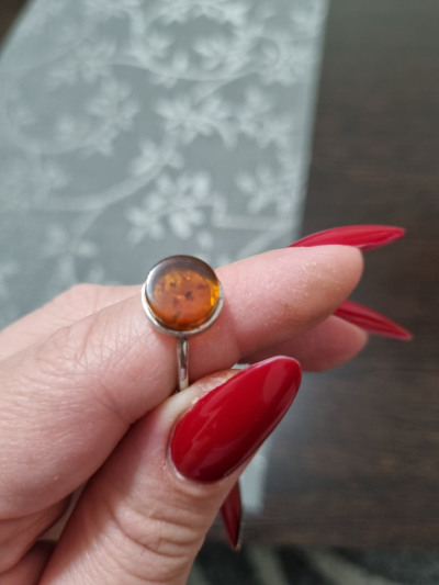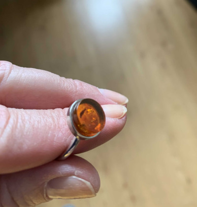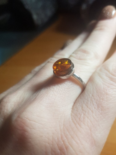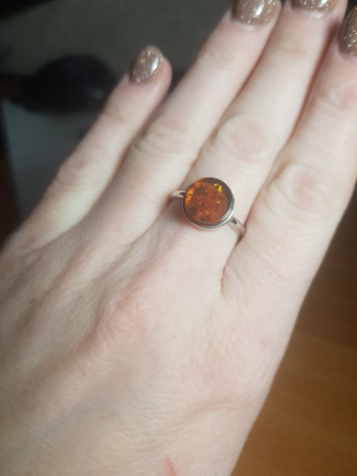 Большое достоинство этого кольца - его цвет; у меня есть несколько колец с янтарем, и все разного цвета. К сожалению, по фотографии на сайте не очень видно, что камень совсем плоский; это разочаровало. Но колечко милое, изящное.