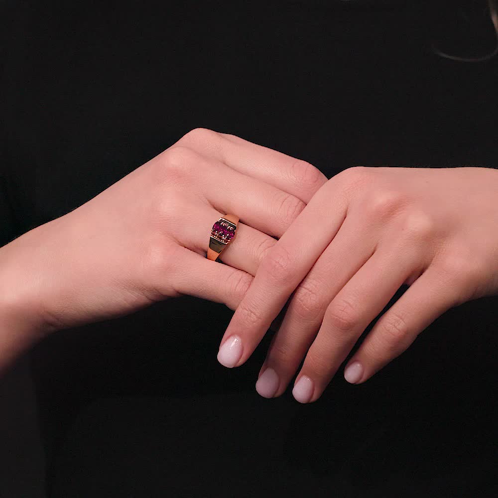 В редких случаях характеристики украшения или упаковка могут иметь отличия от представленных на фото или в описании.Кольцо с 3 родолитами природными, тип огранки Б;