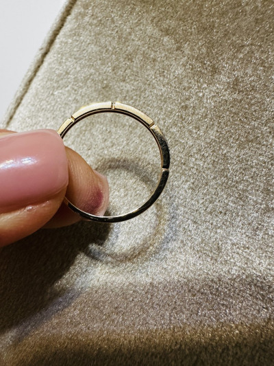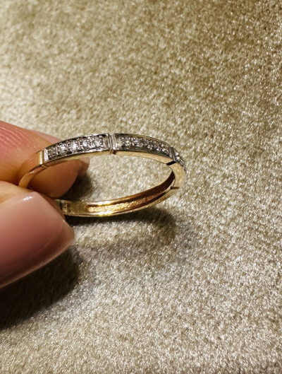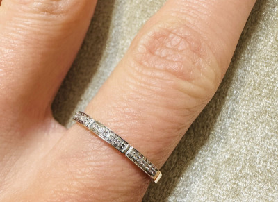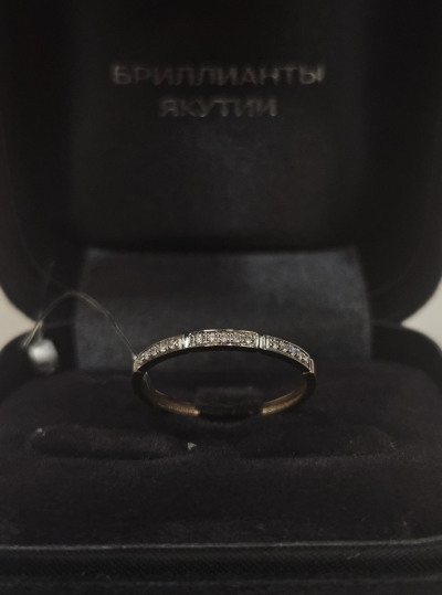 Тоненькое золотое кольцо с бриллиантами. Сдержанное, строгое, для повседневной носки. Можно носить в паре с другим кольцом. Бриллианты маленькие, но при определенном освещение или на ярком солнце красиво поблескивают.
