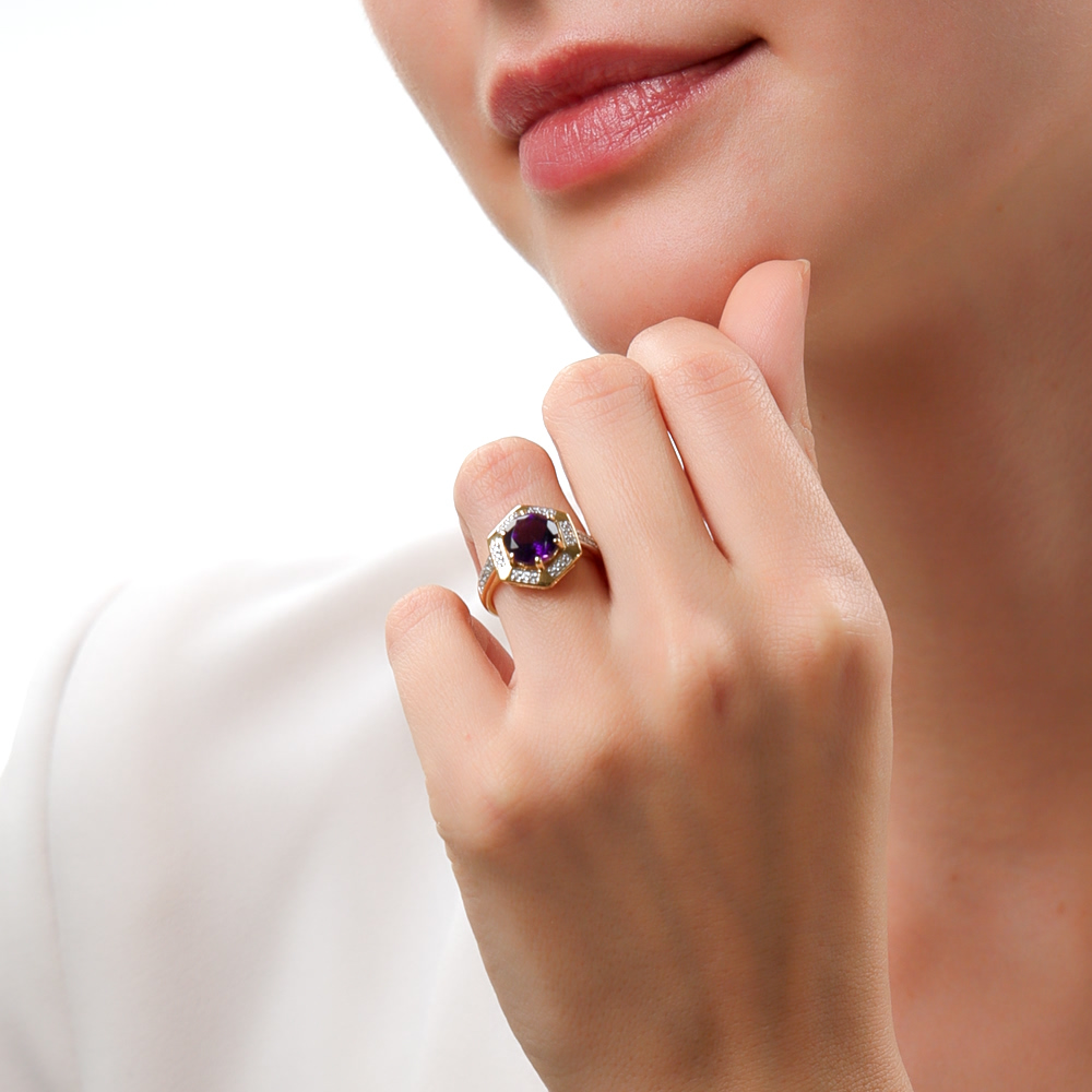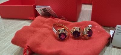 Купила его в комплекте с серёжками. Аметист насыщенного цвета, в обрамлении фианитов смотрится красиво и благородно. Да ещё и лимонная позолота отлично сочетается с аметистом.