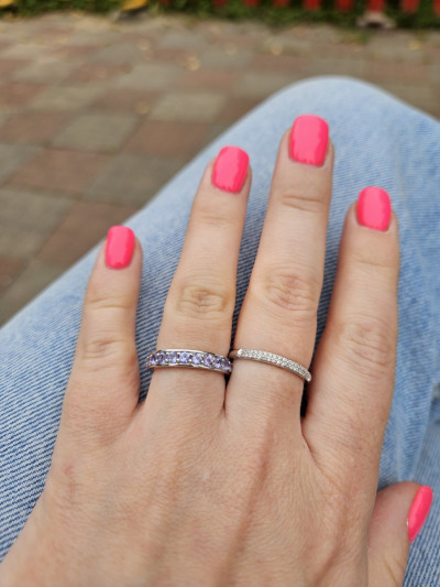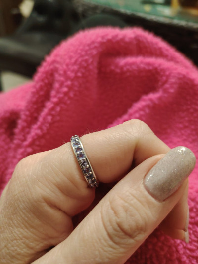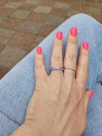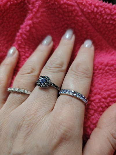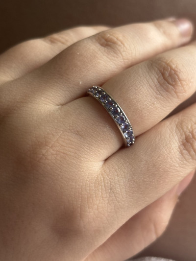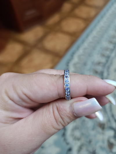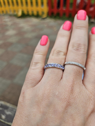 Классное кольцо, мне понравилось. Хотела колечко с дорожкой из танзанитов, обычно ношу золото, но наткнулась на это в серебре и решила взять. Колечко не тонкое, цвет камней играет, не бледные. Рядом кольцо из белого золота, визуально не отличить,тк серебро также покрыто родием.