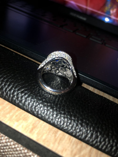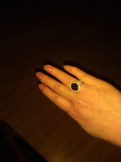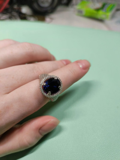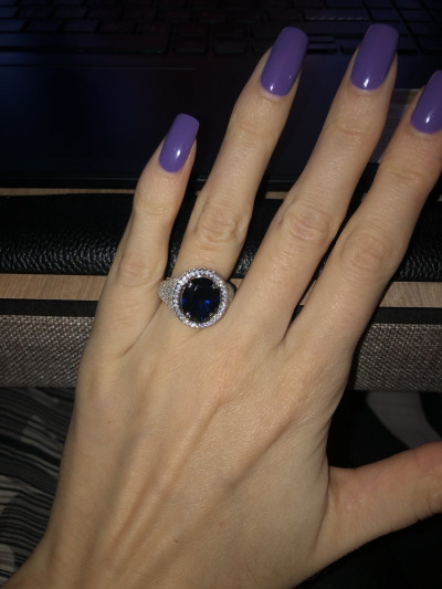 Мне очень понравилось кольцо , подобного не встречала нигде. Размер в размер . Совершенно нетяжелое для меня. Маленькие фианиты переливаются на свету радугой . Камень имеет глубокий синий цвет, очень красивый. Гравировка стоит на внешней стороне кольца и проба на внутренней.