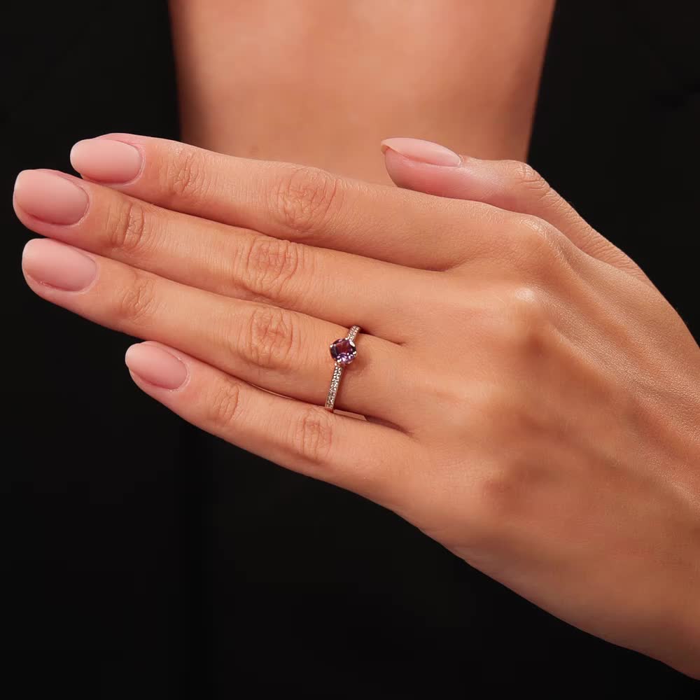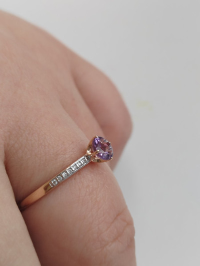 Изысканное кольцо с аметистом весом 0.5 карата и огранкой В. Украшение дополнено фианитами и изготовлено из розового золота 585 пробы