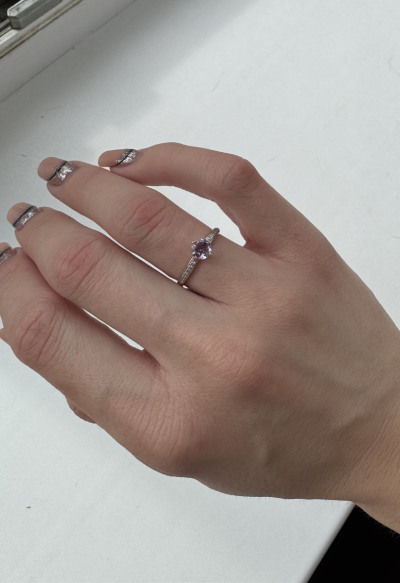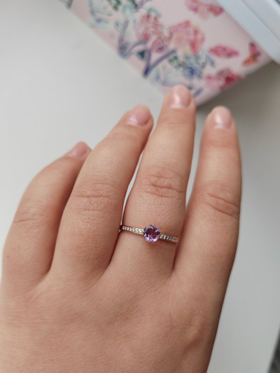 Очень приятное колечко, не фольга, достаточно крепенькое, не прям тонюсенькое, нормальное. Огромные не люблю. Аместит очень красивый, не бледный, не слишком яркий, прозрачный. Очень нежно и эстетично смотрится, даже в пару к обручалке подойдет. Жалко серьги данного комплекта оказались маленькие для полной мочки уха, так бы и серьги купила. Взяла по акции, удачная покупка. 🩷