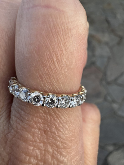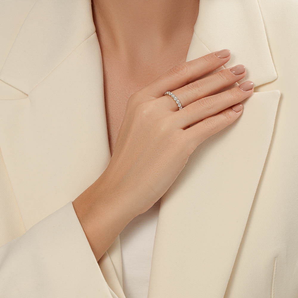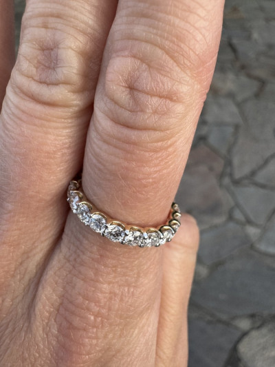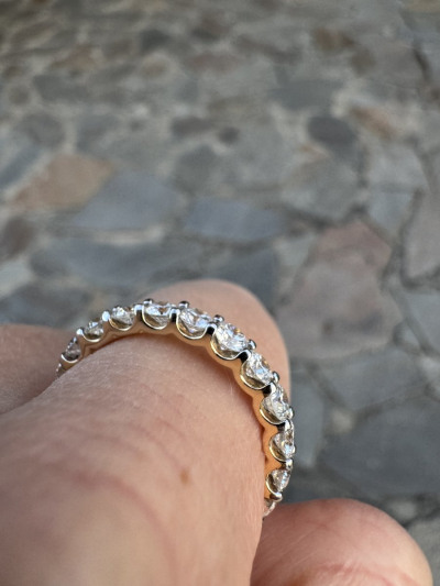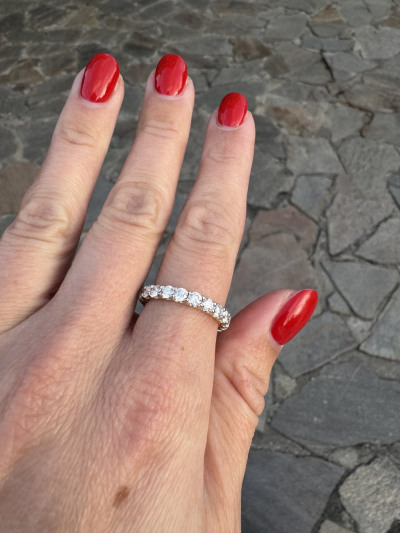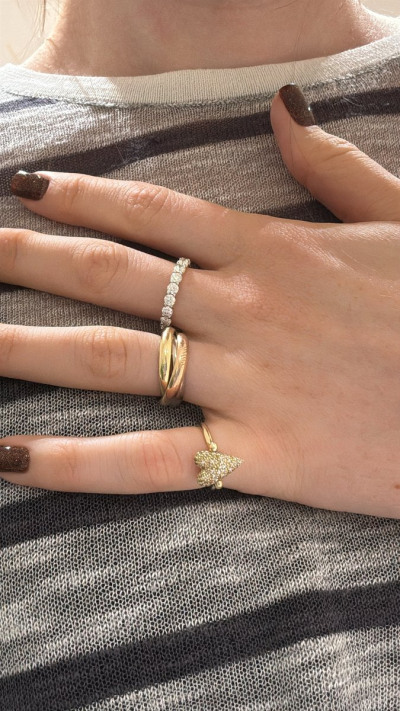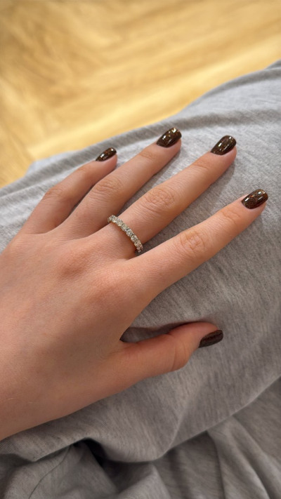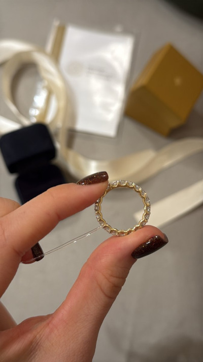 Оно шикарное и как сочетается с другими кольцами💔! взяла в желтом золоте и не пожалела, оттенок по сути и не виден, когда смотришь в целом на кольцо, а цена сильно отличается от белого золота🪽 и я заметила, будто оно чуть больше заявленного размера, 16,5 чуть свободнее село, но это не критично, можно играться с расположением; доставка быстрая, перед покупкой можно примерить и все проверить, дается документ✨ даже жалко носить на каждый день)) читала другие отзывы на дорожки и лучше отдавать раз в год-два ювелиру, чтобы проверять крепление, дабы потом не терять бриллианты! рекомендую