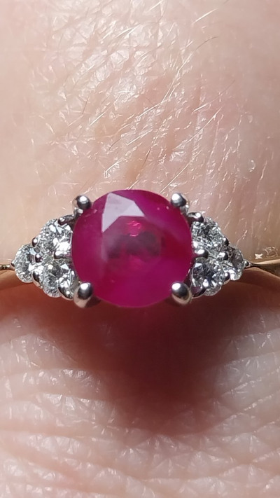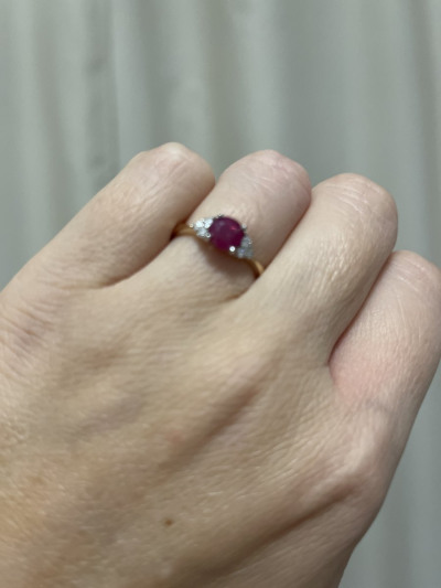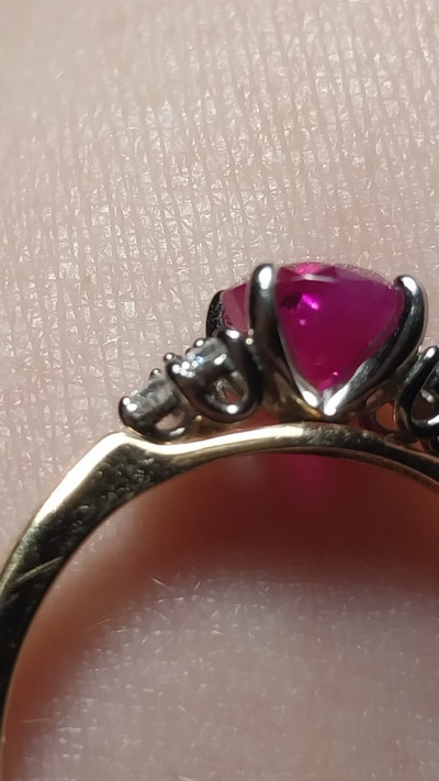 Камень выбрала почти прозрачный, чистота и цвет хорошей характеристики 2,2. Внутри перстень закрыт, что защищает камень от загрязнений. Даже сбоку камень играет гранями. Перстень взяла из-за красоты натурального рубина. Постаралась показать это на фото. Бриллианты 57 граней, немаленькой каратности, целом кольцо лёгкое, достойное.