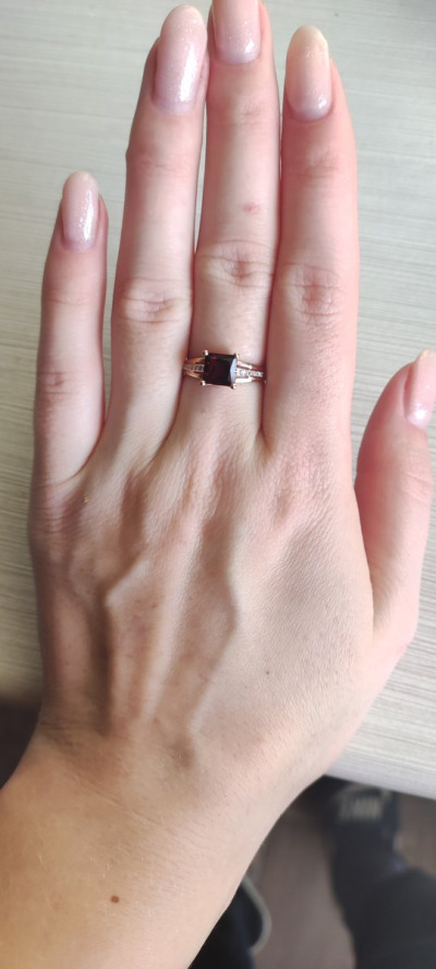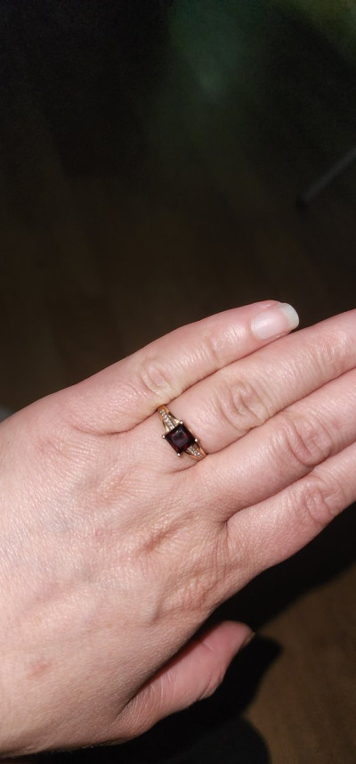 Колечко смотрится чудесно, несмотря на небольшой вес изделия и размеры, все благодаря очень насыщенному красивому гранату. Шинка кольца в нижней части тоненькая, но за счет расширения с бриллиантами ближе к гранату, на руке выглядит довольно солидно. Жене очень понравилось.