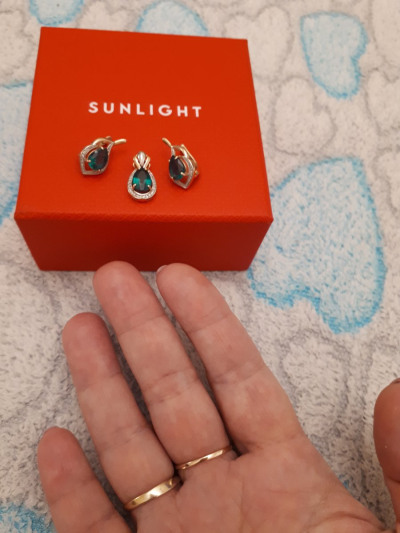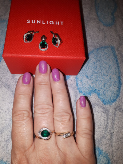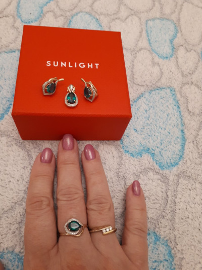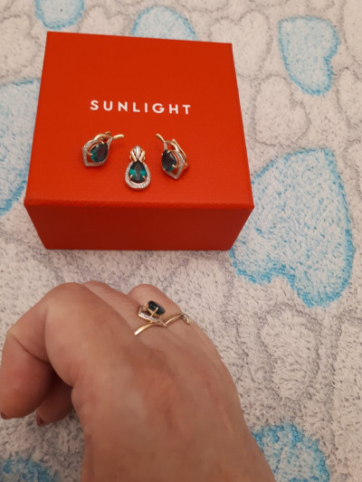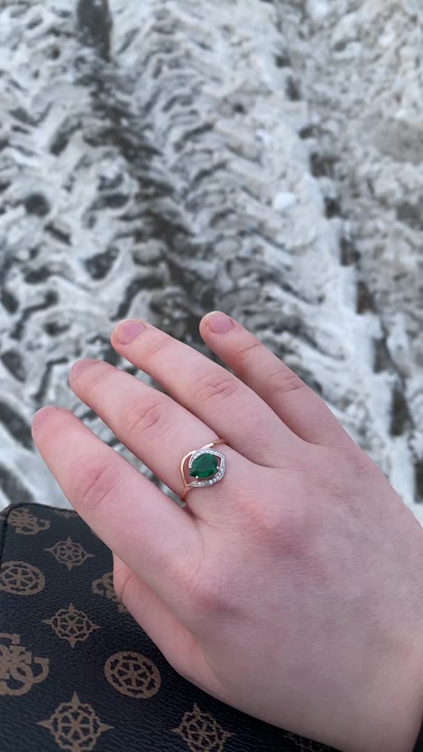 Купила колечко ради крупного зелёного камушка. Золота в нем немного - шинка тоненькая 1 мм, но камушек заметный: около 1 см. Очень яркий, прозрачный, т.к. гидротермальный. Натуральный камень такого размера купить большинство людей не в состоянии, а это кольцо прекрасная альтернатива. В комплект докупила серьги и кулон