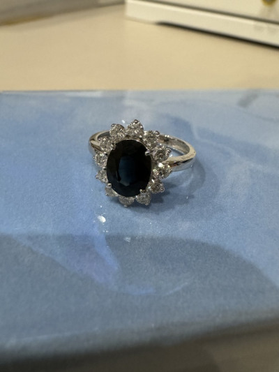 Кольцо очень стильное. Именно темный сапфир в обрамлении бриллиантов (довольно крупных) смотрится универсально и модно
