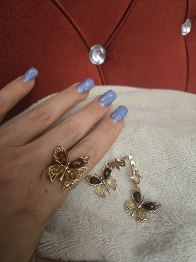 Сначала купила кольцо, оно очень красивое, выглядит как двойная 3D бабочка , она обволакивает палец и парит отрываясь от кольца. Потом решила дополнить и купила серьги. Теперь этот красивый комплект в сборе) но есть и кулон, думаю куплю )))