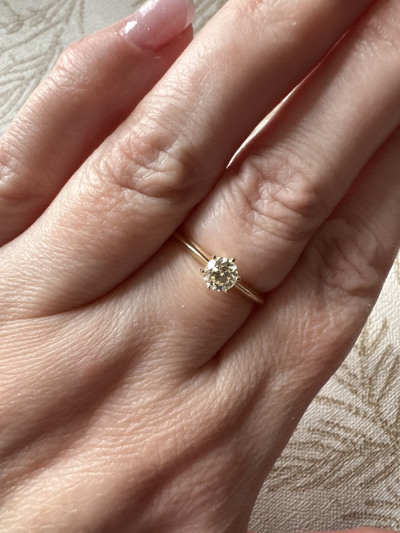 Яркий чистый камень солнечного цвета! Видимых включений не имеет, достался камень 0,41 карат, тонкая шинка, кольцо на руке смотрится очень нежно, красивое заметное колечко!