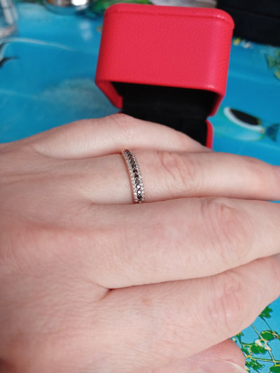 Купила к серьгам клевер, смотрится отлично. Несмотря на .маленькие камушки, колечко сверкает великолепно. Рекомендую к покупке однозначно. Даже с небольшим весом колечко выглядит весомо.