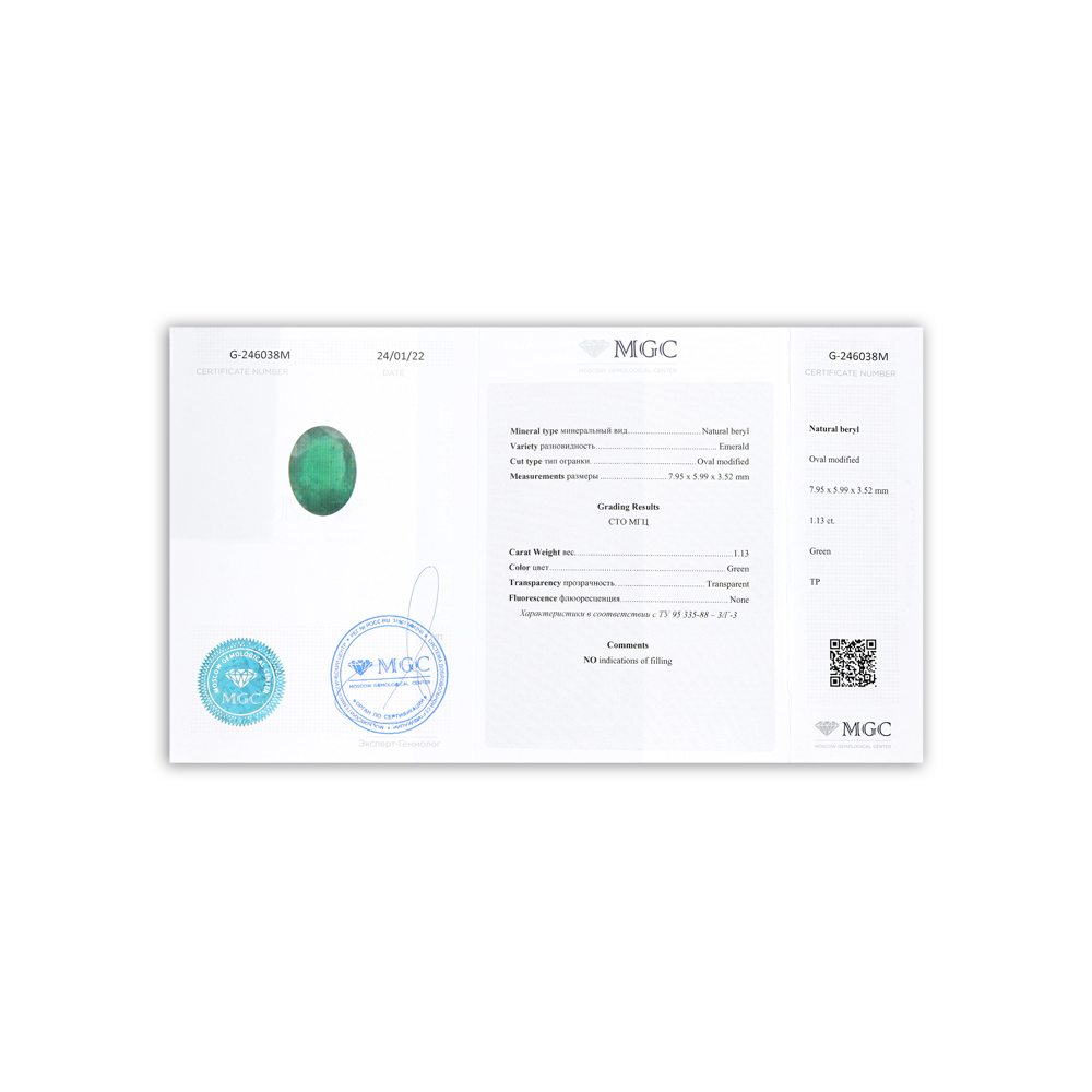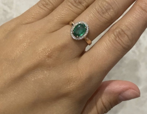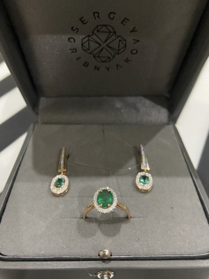 Брала для комплекта к аналогичным сережкам. Камни по цвету и размеру индентичны. В кольце, что мне досталось, изумруд 1,12 карат (облагорожен умеренно маслом). Смотрела более дорогие варианты - с изумрудом та же история (масло и караты), цена растёт только благодаря увеличению каратности бриллиантов. Идёт в размер (16,5). Сертификат МГУ на камень в комплекте.