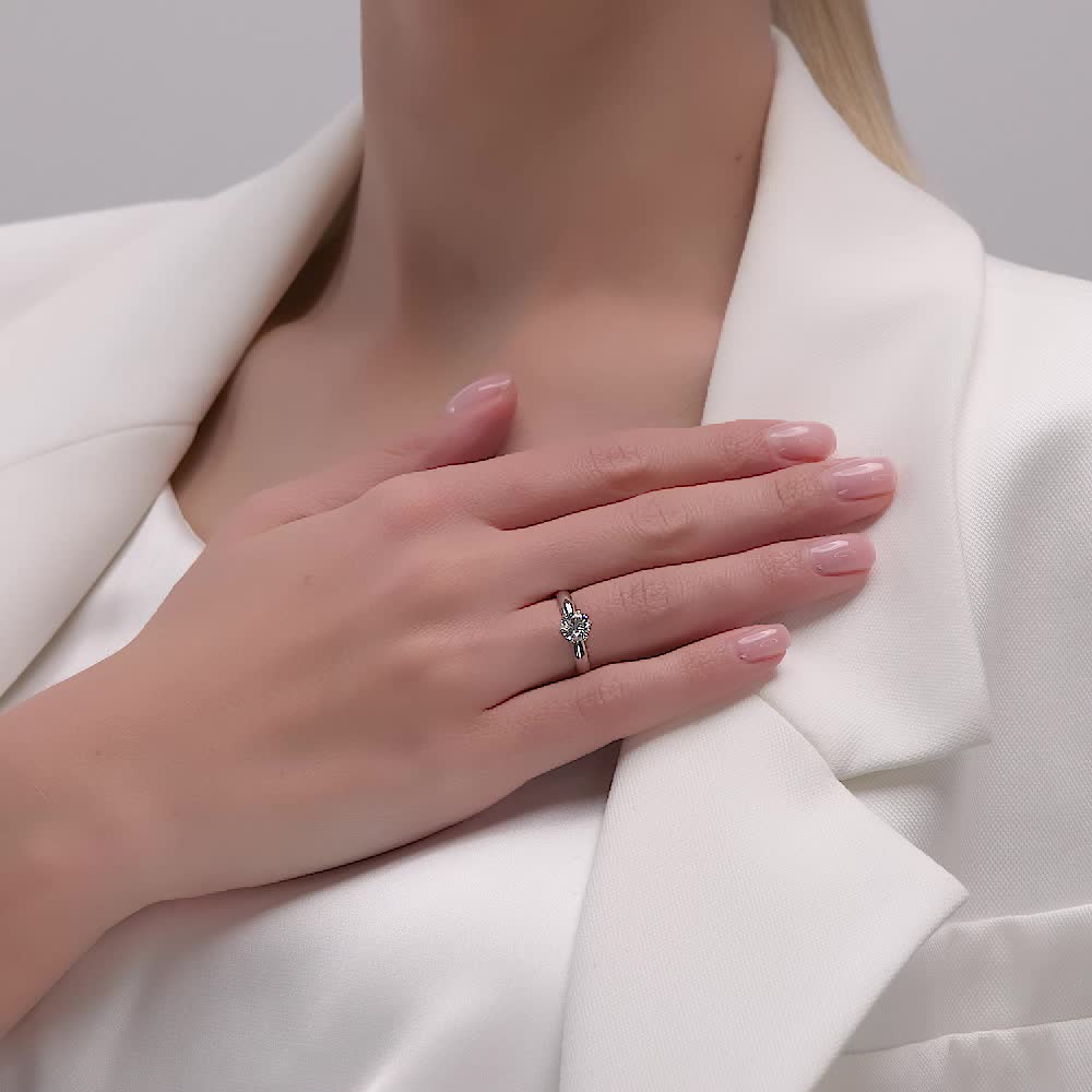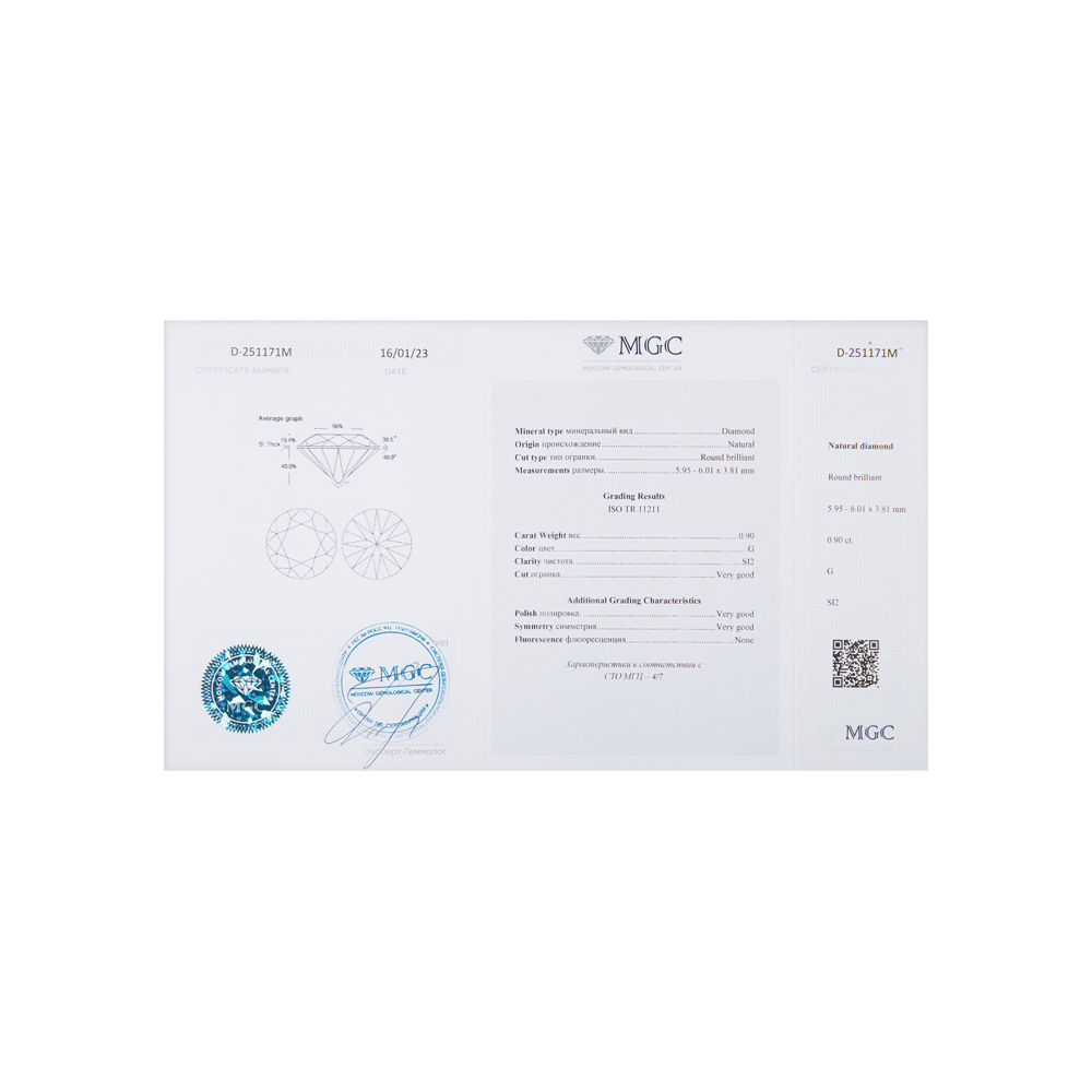Кольцо с 1 бриллиантом природным, 0.9 карат, огранка круг 57 граней, цвет 4, чистота 7, тип огранки А;