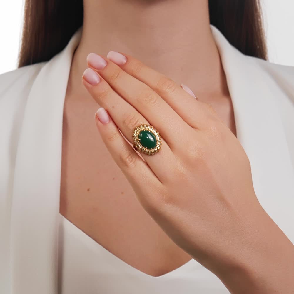 Симпатичное колечко с крупным камнем. Золотистое блестящее обрамление. Немного большемерит. Агат классического цвета зелёный, непрозрачный