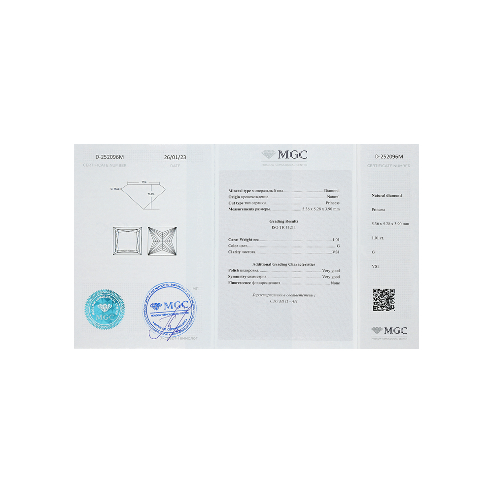 Кольцо с 1 бриллиантом природным, 1.01 карат, огранка принцесса 65 граней, цвет 4, чистота 4, тип огранки А;