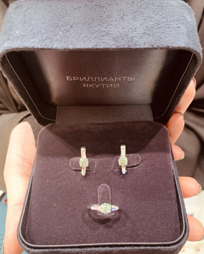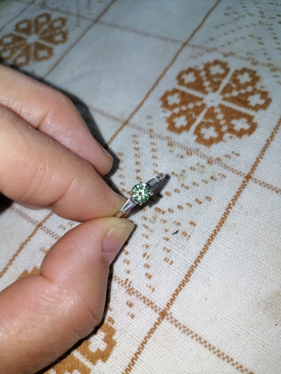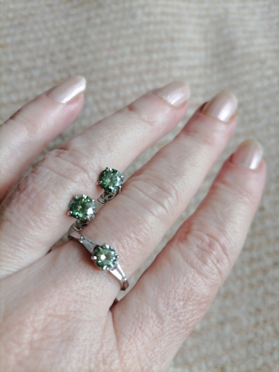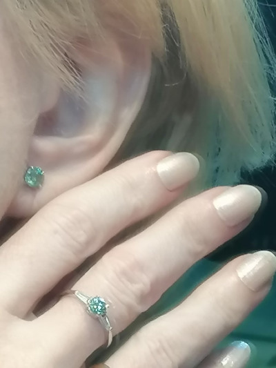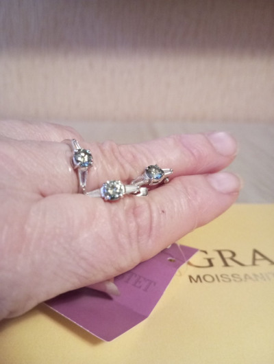 Это кольцо с муассанитом подарил мне муж на 8 марта к пусетам, которые у меня уже были. Получился милый комплект на каждый день. Колечко очень удобное, легкое, на пальце не чувствуется, не цепляется. В размер. Камешек красиво сверкает и переливается. По цвету точно такой же как и пусеты, которые я тоже тут купила. Ношу и радуюсь!