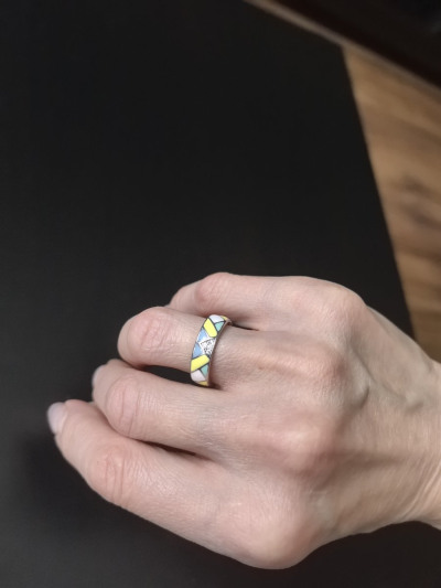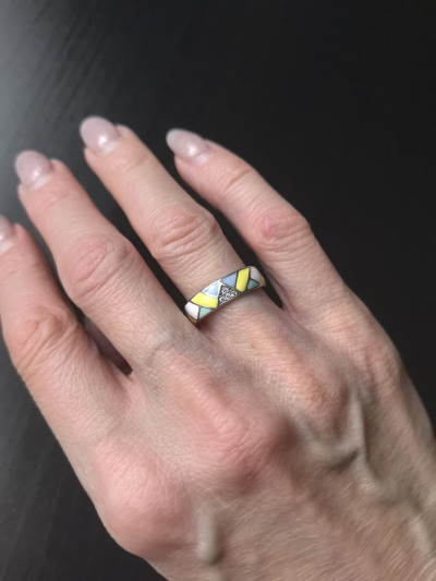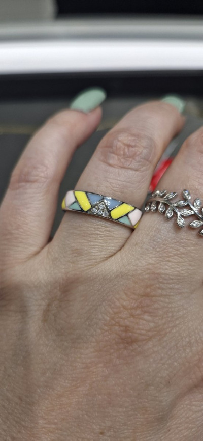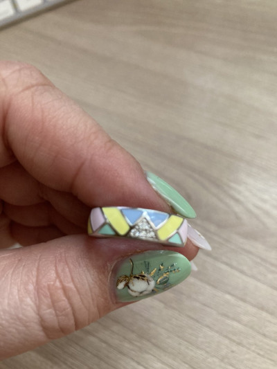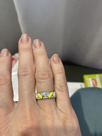 Колечко очень миленькое. Блестящие камушки сверкают и переливаются на свету. Разноцветные вставки очень приятных расцветок позволяют сочетать с разной одеждой. Подходит для летних образов со светлыми женственными платьями. Также отлично будет смотреться со светлым пуховичком и белыми/голубыми джинсами к примеру. Рекомендую!