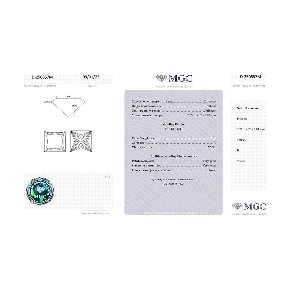 Кольцо с 1 бриллиантом, 1.01 карат, огранка принцесса 65 граней, цвет 5, чистота 3, тип огранки А;