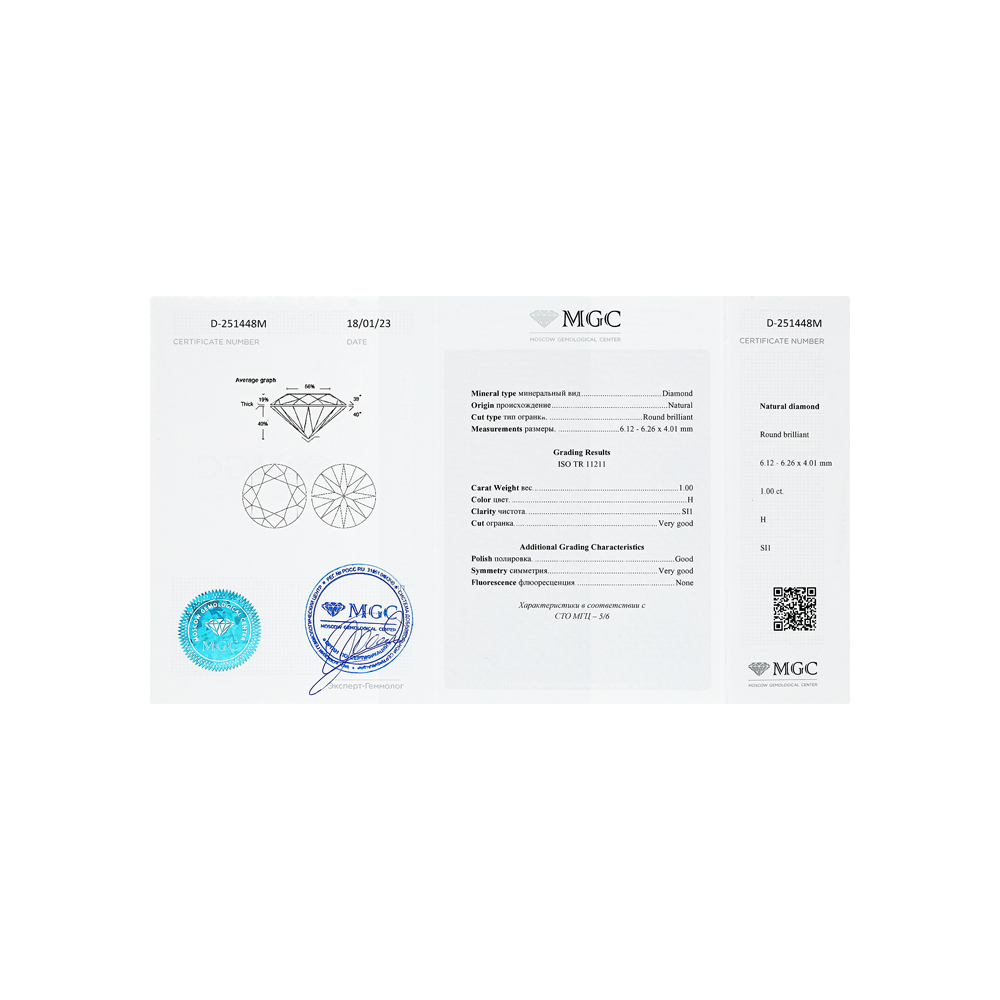 Кольцо с 1 бриллиантом природным, 1 карат, огранка круг 57 граней, цвет 5, чистота 6, тип огранки А;