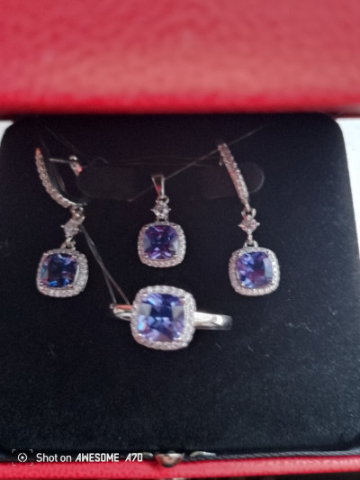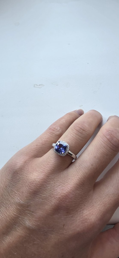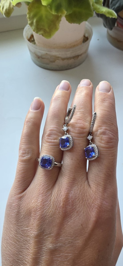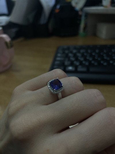 Кольцо💍 замечательное, с синим камешком. Купили 🛍 вместе с серьгами. Цвет у алпанита🪻🪻🪻 такой красивый и необычный, похож на яркий васильковый танзанит. Квадратный 💠 камень обрамлён сверкающими фианитами.