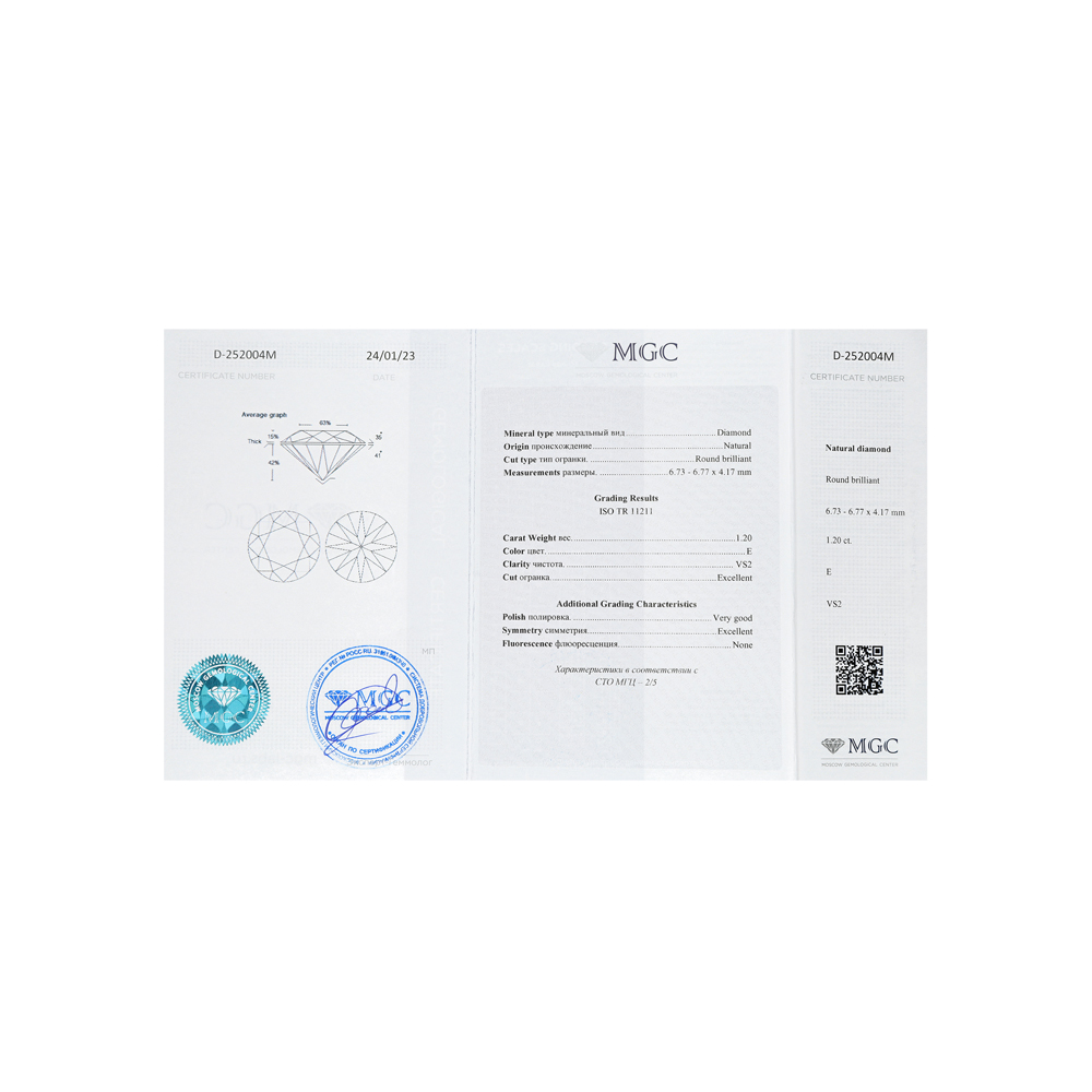 Кольцо с 1 бриллиантом природным, 1.2 карат, огранка круг 57 граней, цвет 2, чистота 5, тип огранки А;