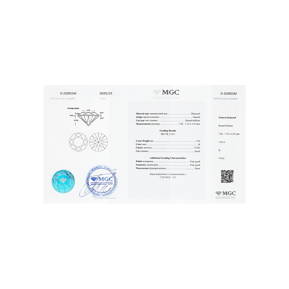 Кольцо с 1 бриллиантом, 1.5 карат, огранка круг 57 граней, цвет 5, чистота 3, тип огранки А;