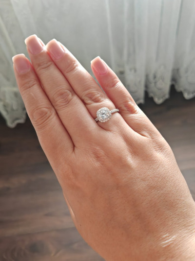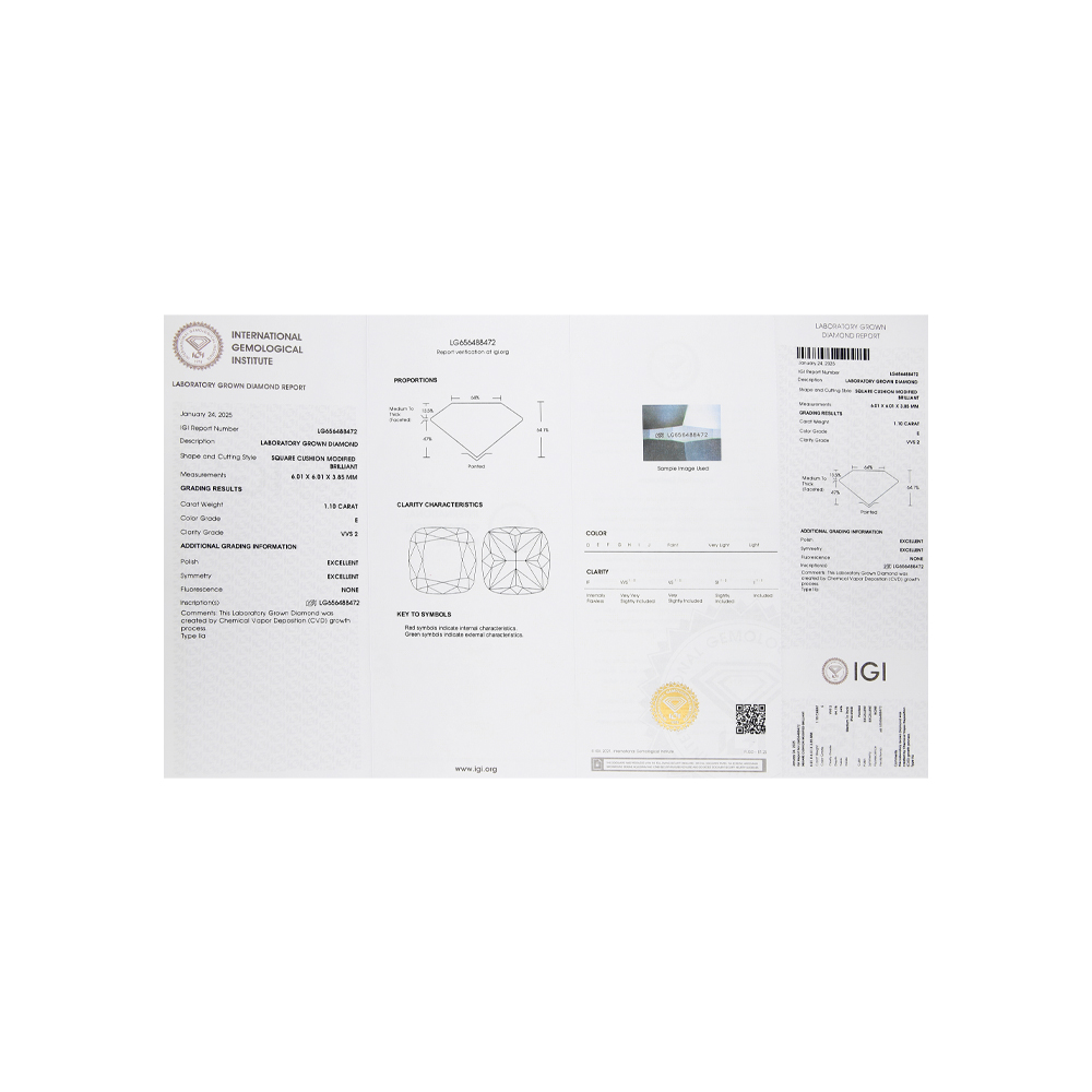Кольцо с 1 бриллиантом выращенным, 1.08 карат, огранка кушон 57 граней, цвет 4, чистота 5, тип огранки А;