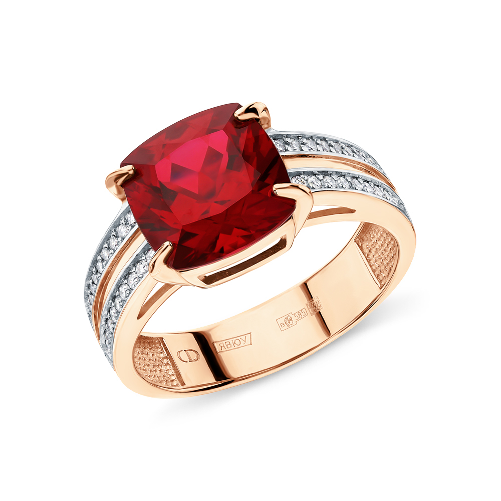Золотое кольцо с бриллиантами выращенными и рубинами выращенными