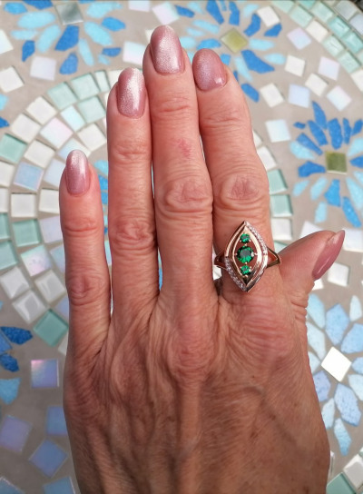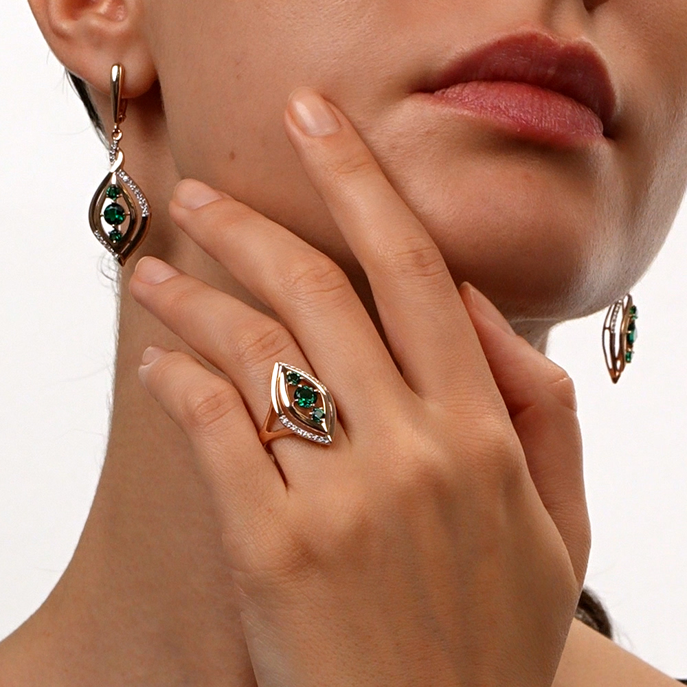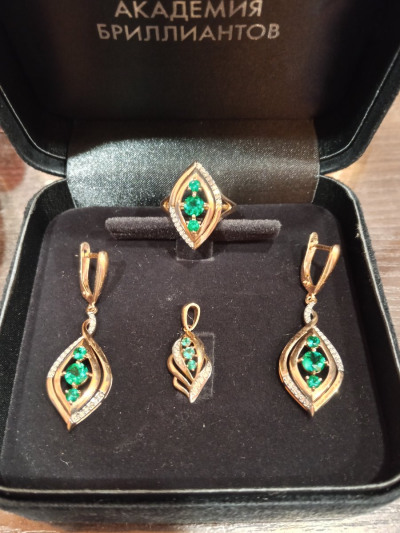Купила сразу набор: серьги, кольцо и кулон. Смотрится кольцо в наборе великолепно: женственно, изысканно, особенно подходит к зеленым глазам... Бриллианты великолепно сверкают с зелеными изумрудами... и глазами...