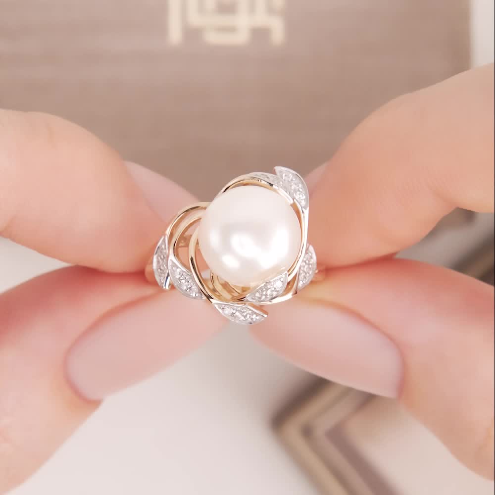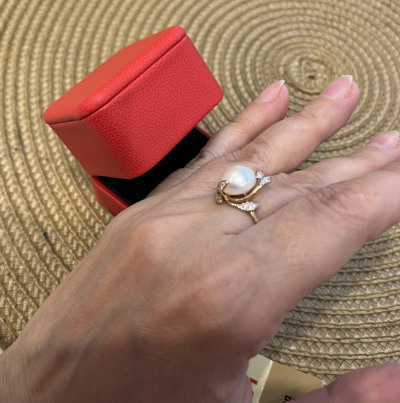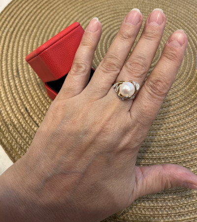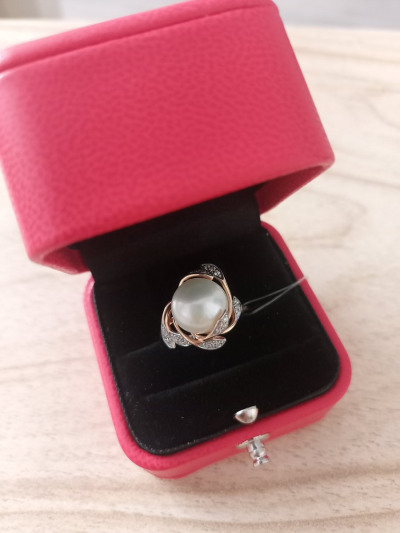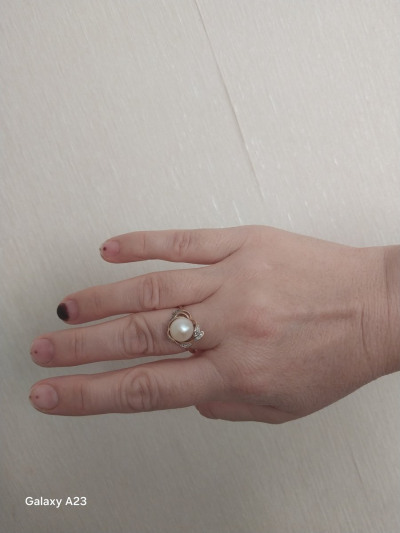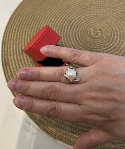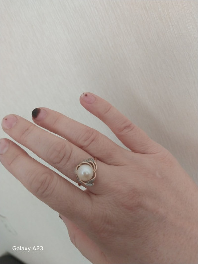 Ажурное золотое кольцо с натур жемчугом и фианитами, на пальце выглядит значительно и празднично, жемчужина прекрасна!