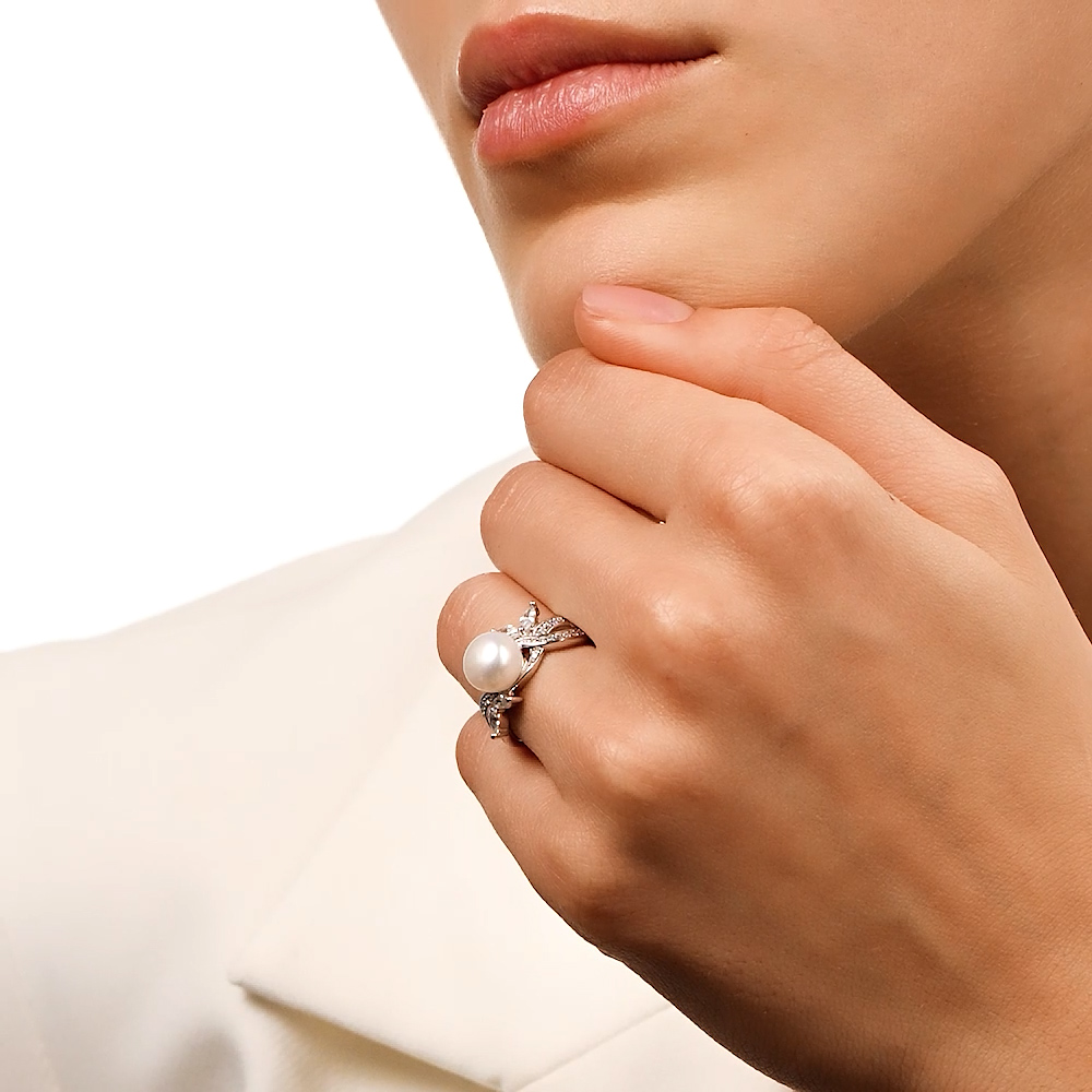 Нежностью своей покаряет колечко из серебра с жемчугом и фианитами. Цветочный арнамент настраивает на романтический стиль. Тонко и изысканно выглядит на пальчике, спасибо Санлайт за акции