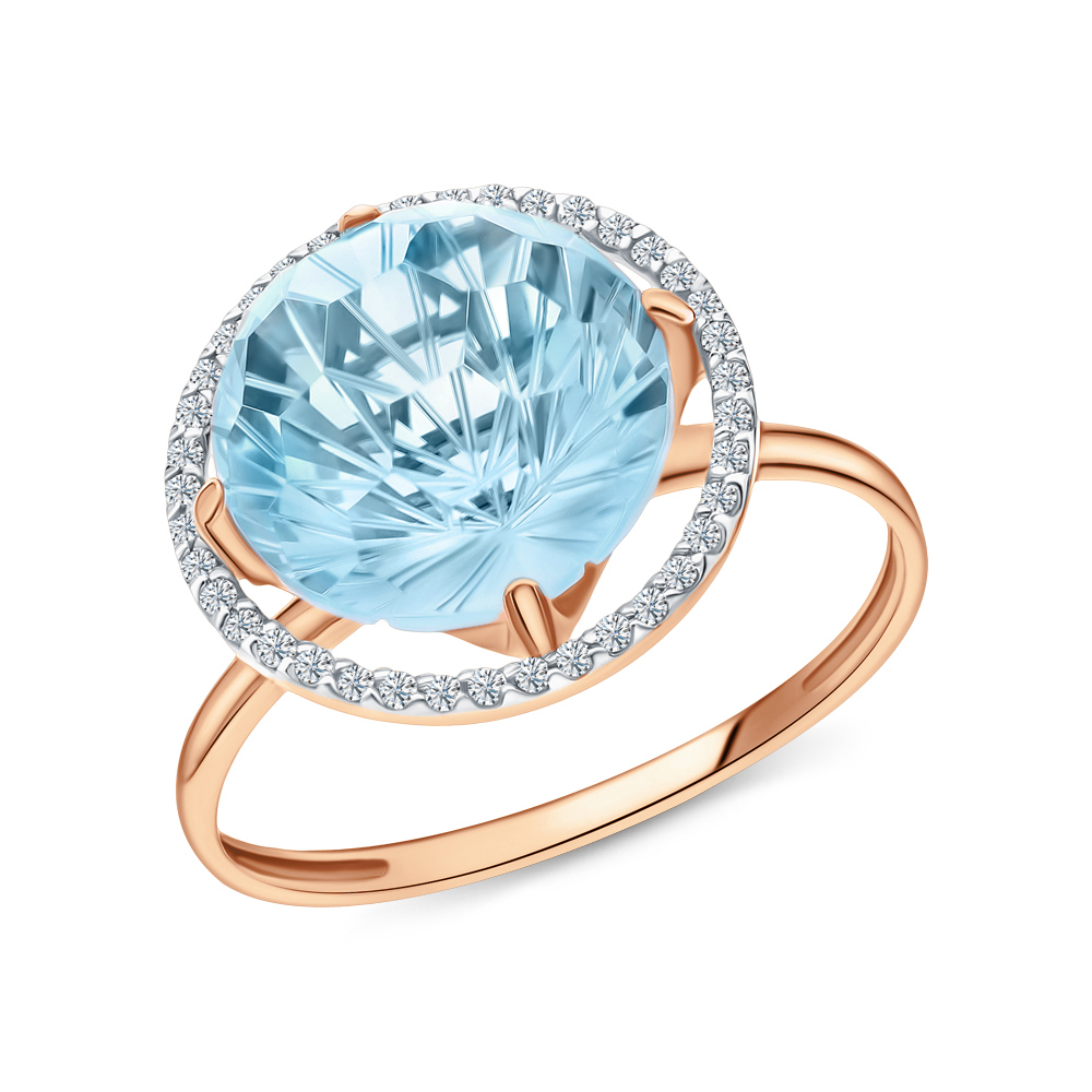 Элегантное кольцо из розового золота 585 пробы, которое обязательно привлечет внимание своим блеском и изысканным дизайном. В центре кольца расположен 1 топаз весом 4.419 карата, который обрамлен 38 бриллиантами общим весом 0.084 карата. Характеристики бриллиантов: