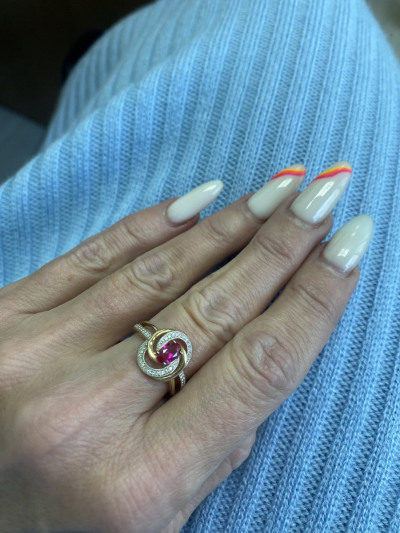 Очень оригинальное колечко. Смотрится модель прекрасно, бриллианты сияют шикарно. Хотелось бы серьги и кулон в комплект, но увы нет пока.