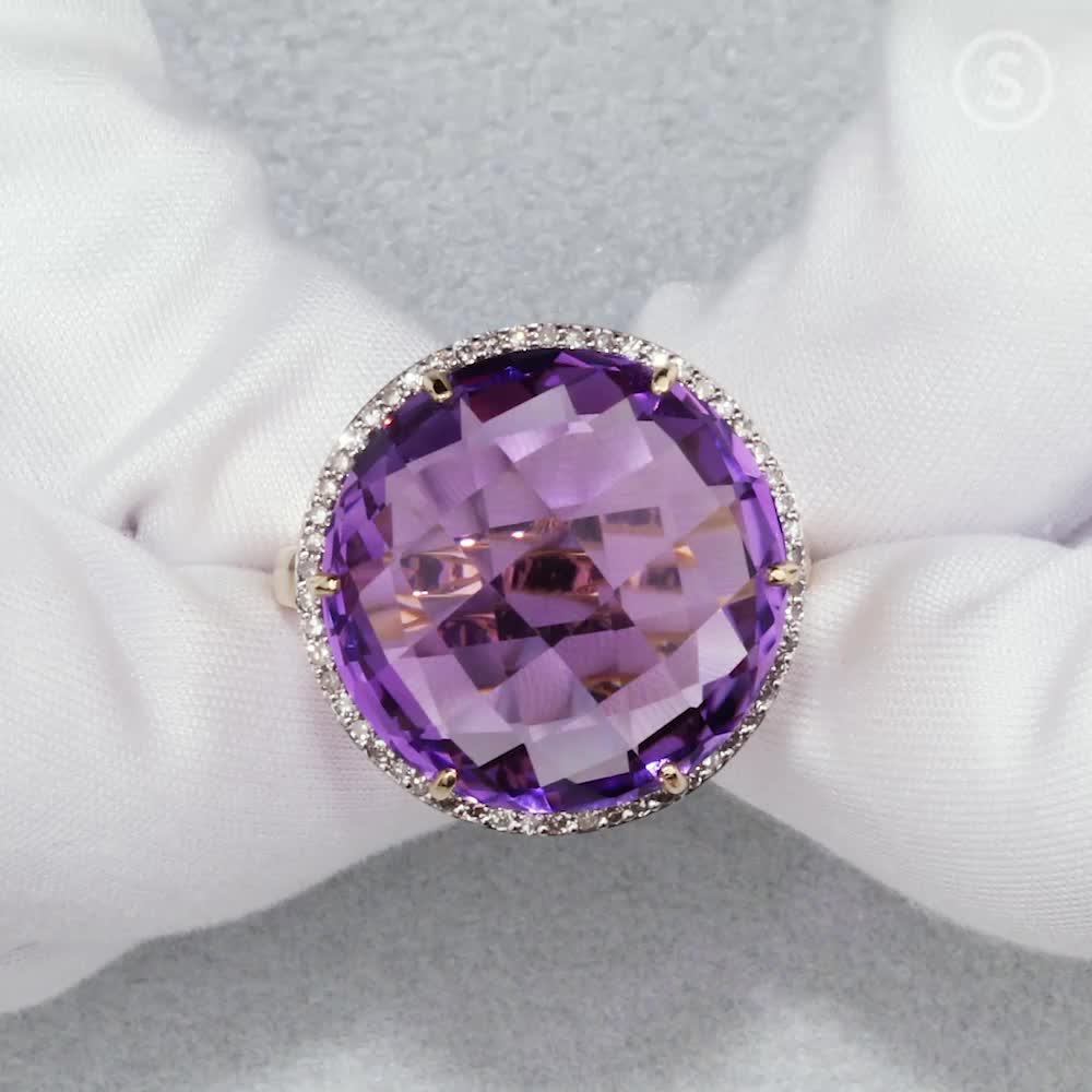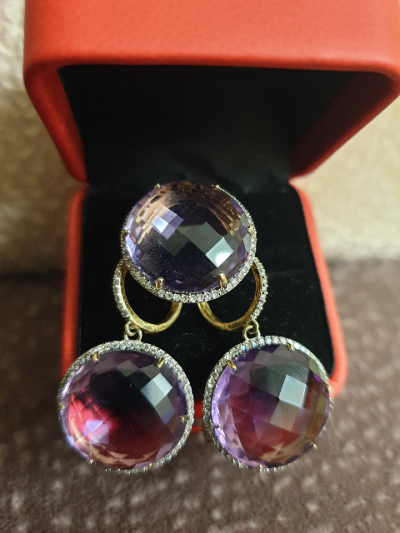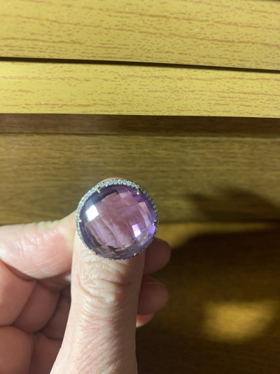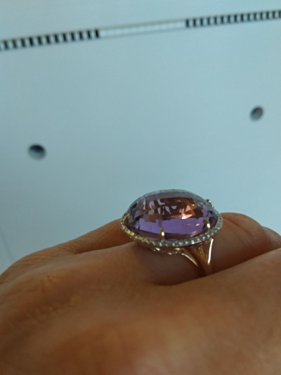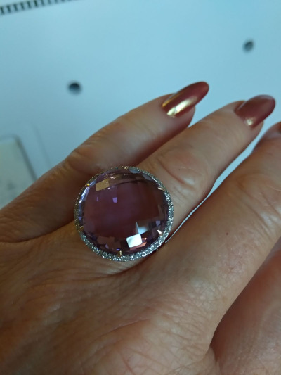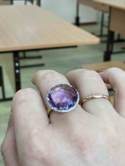 Муж подарил на годовщину свадьбы кольцо с аметистом и брильянтами . Выглядит сногсшибательно! Мужчины, покупайте своим дамам такую красоту!!! Это что то!!! Камень крупный, но в обрамлении брильянтов смотрится очень изящно! Конечно на работу не оденешь, но на остальных мероприятиях вы будете в центре внимания!