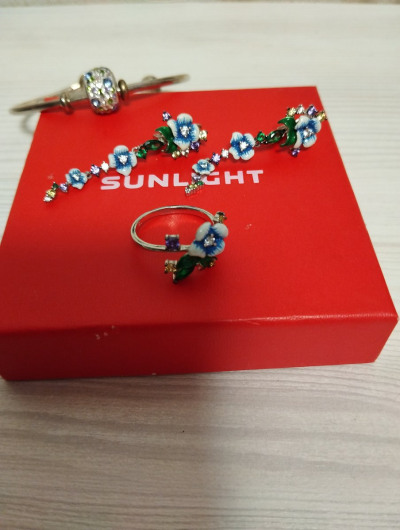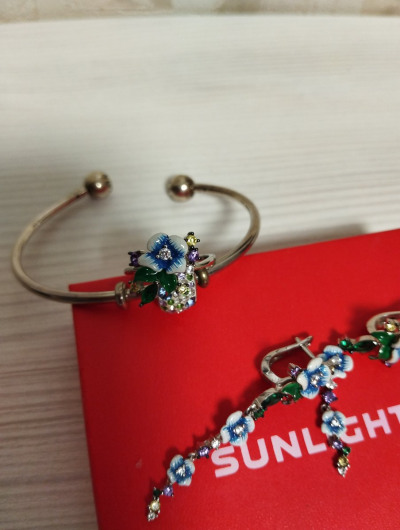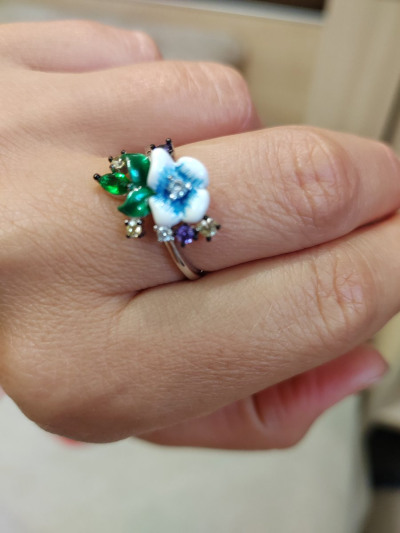 Покупала в комплекте с серьгами. Подойдёт к любому летнему платью, особенно голубому. Эмаль делает колечко ярким, а кристаллики блестят на солнце. Очень красиво.