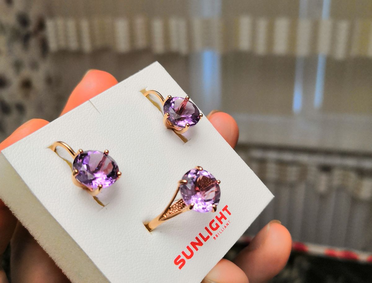 Купила золотой комплект с аметистами. Цвет камня неяркий, очень нежно смотрится. Довольна. Нашла на сайте, пришел заказ быстро. Продавец внимательна, искренна. Спасибо!!!