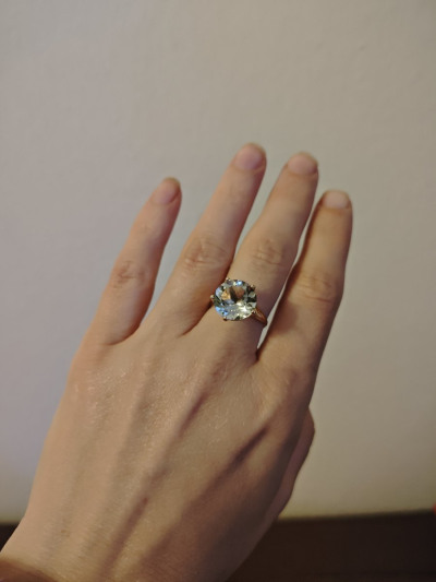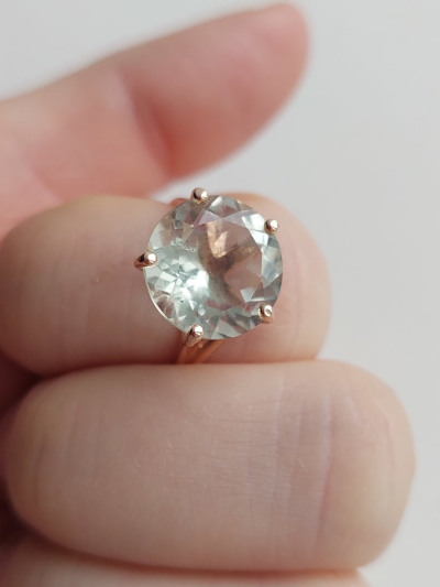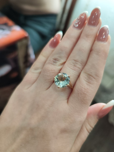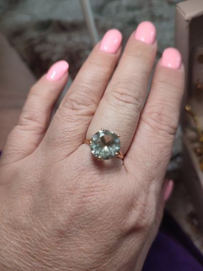 Изысканное кольцо с зеленым аметистом весом 6.08 карата изготовленно из розового золота 585 пробы. Аметист считается символом мудрости, кольцо с этим камнем станет отличным подарком на юбилей или день рождения.
