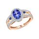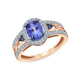 Кольцо с 56 бриллиантами, огранка круг 57 граней, 0.29 карат, цвет 4, чистота 6, тип огранки А; 2 сапфирами, 0.05 карат, цвет 4, чистота 3, тип огранки В;1 танзанитом, 1.01 карат; Розовое золото 585 пробы.