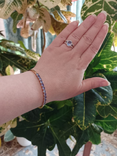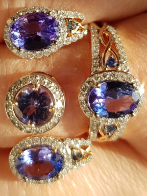 Чудесный комплект с танзанитами, сапфирами и бриллиантами в розовом золоте очень нарядный, не остается без восхищения окружающих и поднимает настроение хозяйке. Меняется цвет танзанита от ярко-голубого до фиолетового в зависимости от освещения.