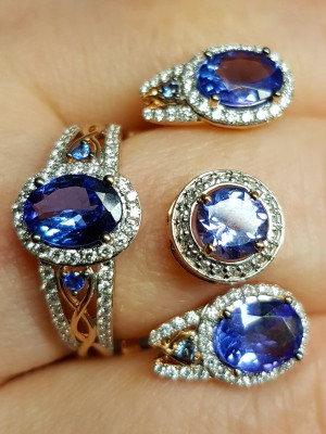 Танзаниты - редчайшие камни из единственного месторождения в мире у подножья горы Килиманджаро в Танзании. Самые интригующие и желанные камни нашего времени. Считается, что танзанит способствует развитию интуиции и успешному поиску смысла жизни, приносит уют и взаимопонимание в семью.