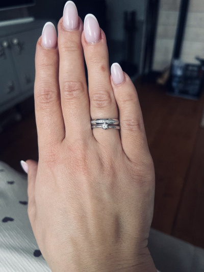 Кольцо , которое загадала 😁 Очень довольна покупкой 👍🏼 Вместе с помолвочным кольцом , смотрится нежно и лаконично !