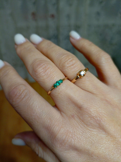 Комбинация 3 гидротермальных изумрудов создает для изделия неповторимый блеск и привлекательность. Центральный изумруд — 0.095 карата, остальные весят по 0.105 карата.