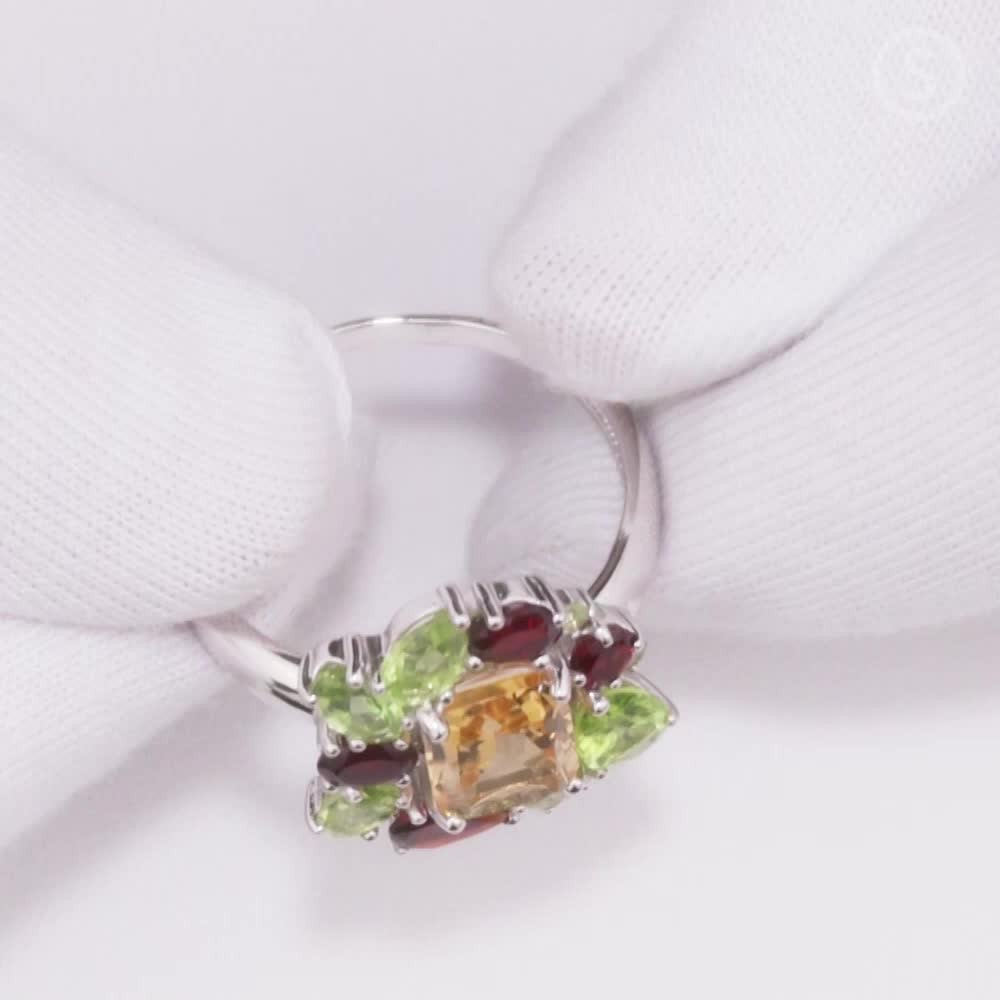 Серебряное кольцо с цитринами природными, гранатами природными и хризолитами природными