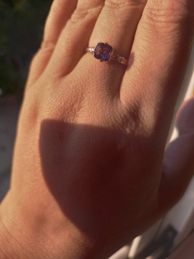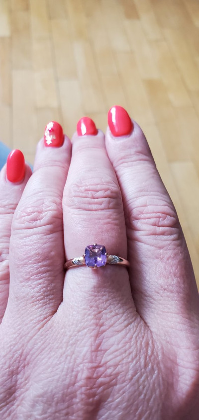 Колечко необыкновенное! Очень воздушное, милое, померяла и поняла, что сразу в нем пойду...камень ничего не цепляет, на пальце не чувствуется, у меня вес 1,61 грамм и чуть меньше 1 карата аметист, я довольна!