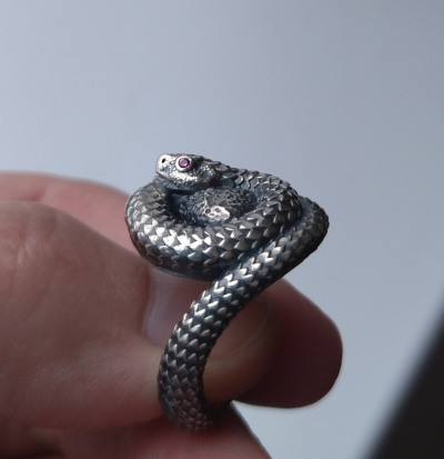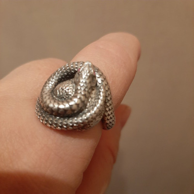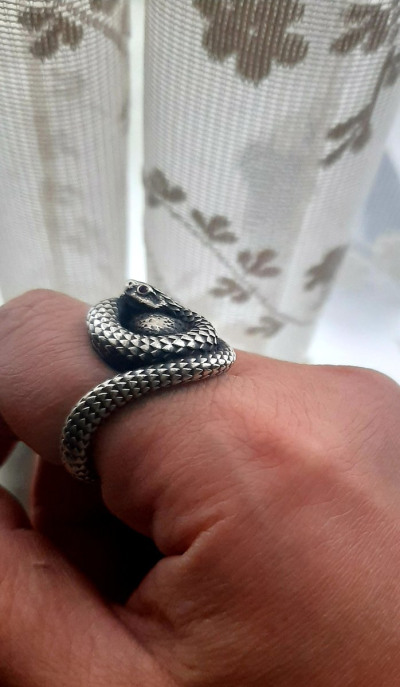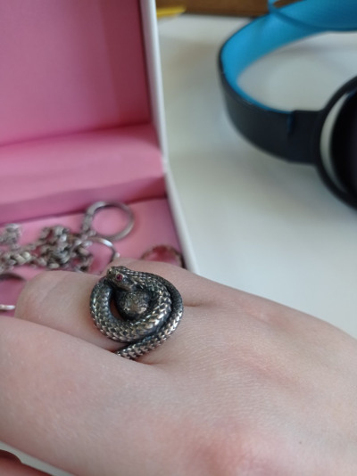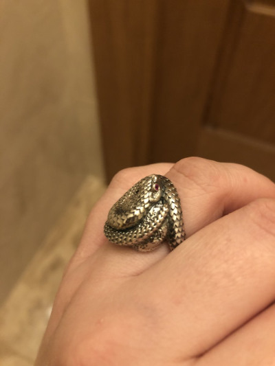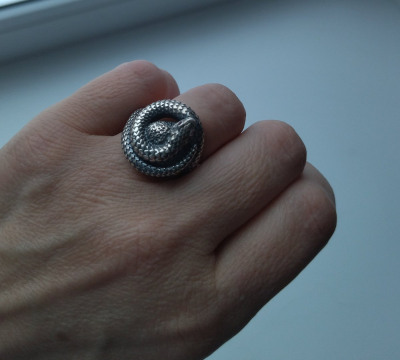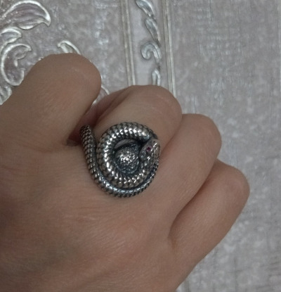 Оригинальное кольцо с чернением и камнями. Кольцо выполнено очень кропотливо, каждая деталь, такая как чешуйки, глазки делают змейку словно живой. Удобное в носке. Очень стильное прочное кольцо. Рекомендую.